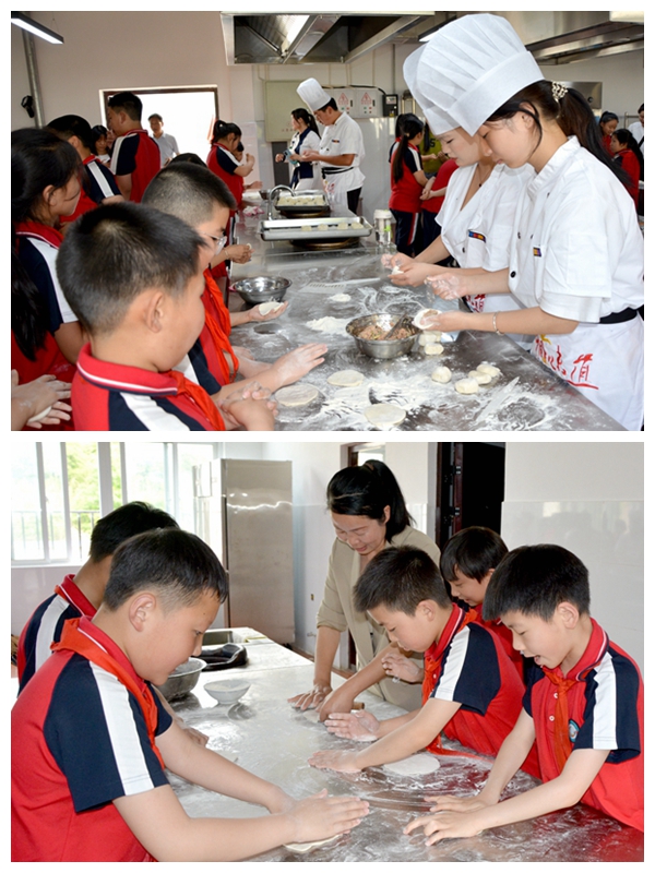 烹饪室里,“中式面点制作体验活动”正如火如荼地进行着,孩子们睁着亮晶晶的大眼睛,仔细观摩大哥哥大姐姐们的手法,然后也动手捏面团和包包子。烹饪专业的老师同学耐心地在一旁给予指导和帮助,大小朋友们都露出了开心的笑容,结束后还一起品尝了美味的包子。