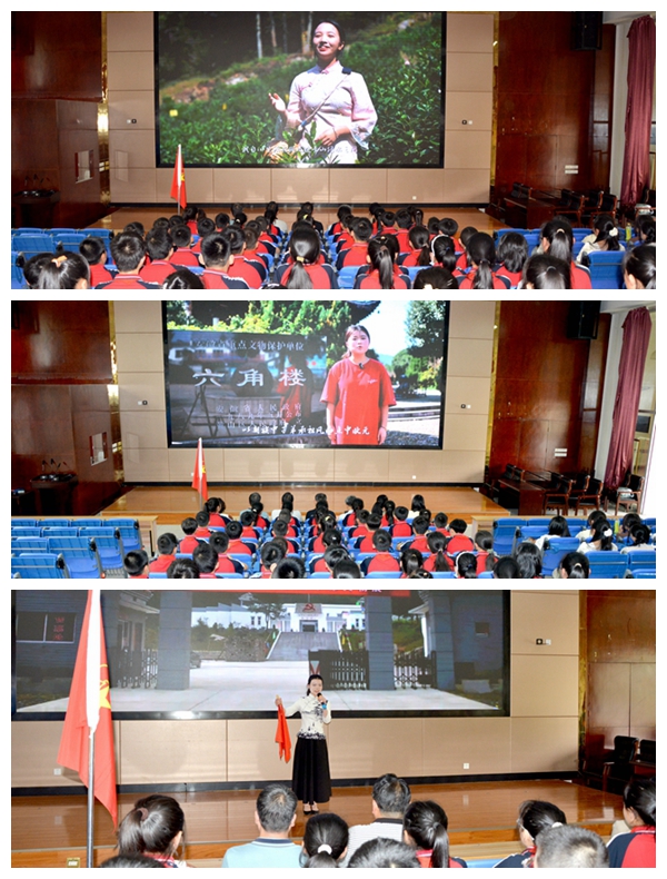 在大礼堂,孩子们先观看了在长三角旅游职业教育联盟“我为家乡代言”特色产品解说比赛中获一等奖的两个导游讲解视频——《太平猴魁》和《六角楼》,孩子们仿佛身临其境,感受到了家乡风物特产和标志性建筑的魅力与深厚底蕴。随后,由学校2023-2024年度安徽省职业院校技能大赛导游服务赛项一等奖的汪文汇同学为大家现场展示了一段中国工农红军北上抗日先遣队纪念馆的讲解,希望每位小朋友都能成为家乡的小小讲解员。