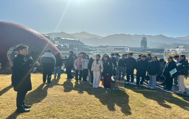 在企业现场,师生们沿着谭家桥文旅发展脉络,先后参观悠悠湖的生态景观打造、溪隐十里的特色业态布局。沿途,专业导师结合黄山旅游T1线建设规划、东黄山国际旅游度假区发展定位,为学生细致讲解文旅项目运营、游客动线设计、酒店服务管理等核心内容,导师们将课堂理论与区域发展实际紧密结合,让学生们直观感受到旅游行业的转型趋势与职业机遇。