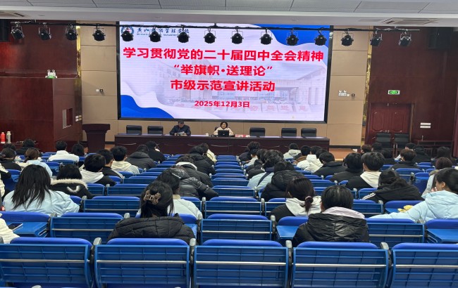 12月3日下午,黄山市“举旗帜·送理论”学习贯彻党的二十届四中全会精神专题宣讲走进黄山旅游管理学校。中共黄山市委党校党史党建教研室主任、副教授,安徽省徽学会副秘书长毛新红教授作宣讲报告。学校党委书记项文忠同志主持报告会议黄山旅游管理学校领导班子、部分教职员工和首届全体高职新生参加。